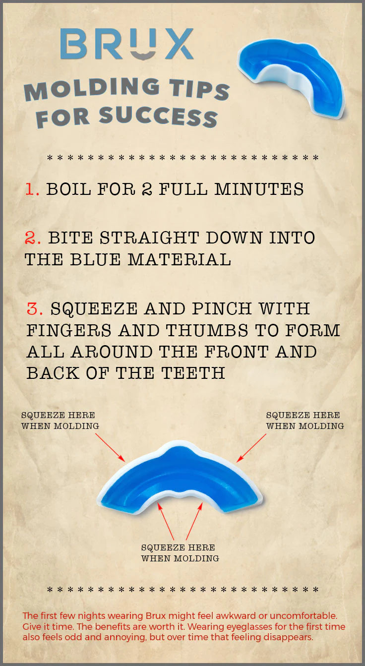 The Brux Night Guard is made with two different materials that work together to provide a durable outer shell with a boil and bite inner tray that is molded for a comfortable and secure fit. If your first attempt at molding doesn't provide a fit that feels right, it can be remolded again following the same instructions. The Brux Night Guard is designed to be worn on the TOP or BOTTOM teeth depending on your preference. DO NOT use the Brux Night Guard if you have missing teeth or wear braces, caps, implants, dentures, retainers or other external surface devices.